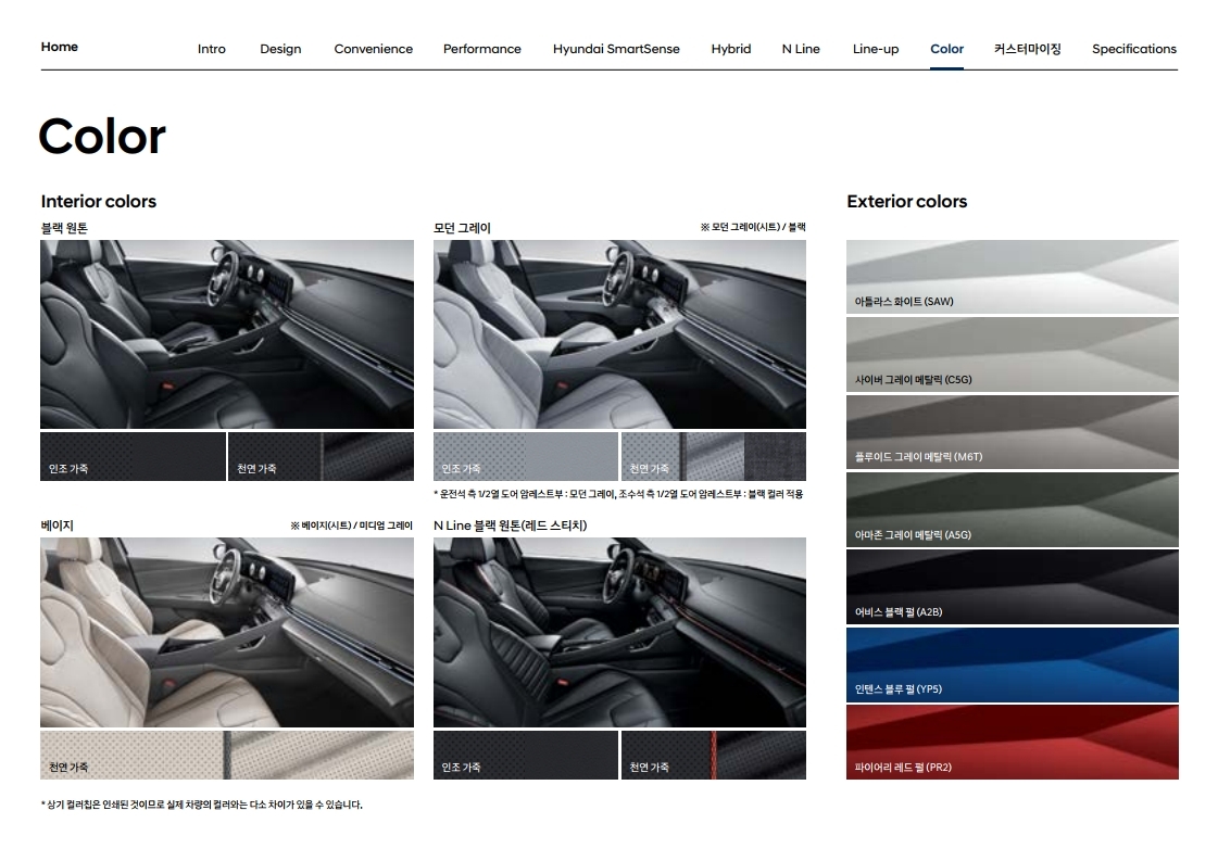 인테리어 컬러는 두 가지. 블랙 원톤과 모던 그레이 컬러 중 선택할 수 있습니다(직물 시트는 블랙 인테리어만 가능). 참고로 모던 그레이를 선택하면 센터 콘솔과 도어 트림에도 포인트 컬러가 들어갑니다. 보태어 천연가죽 사양의 모던 그레이 인테리어는 도어 트림과 헤드레스트 뒤편을 직물로 마감해 차별화합니다.