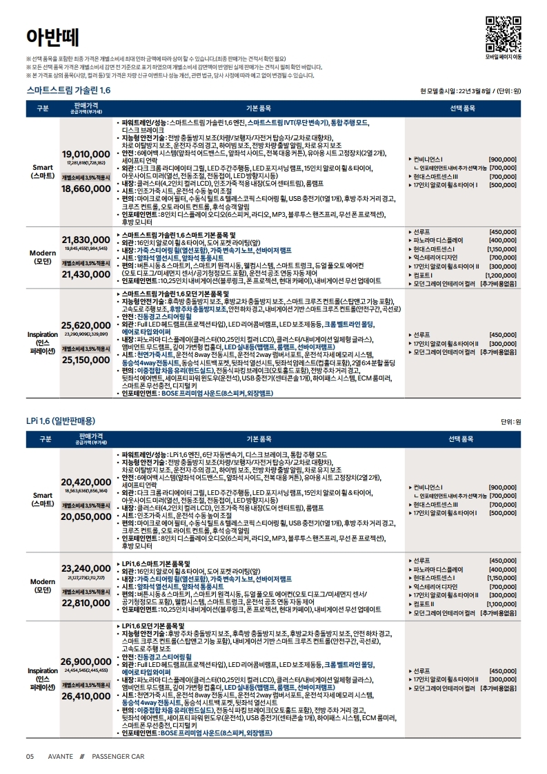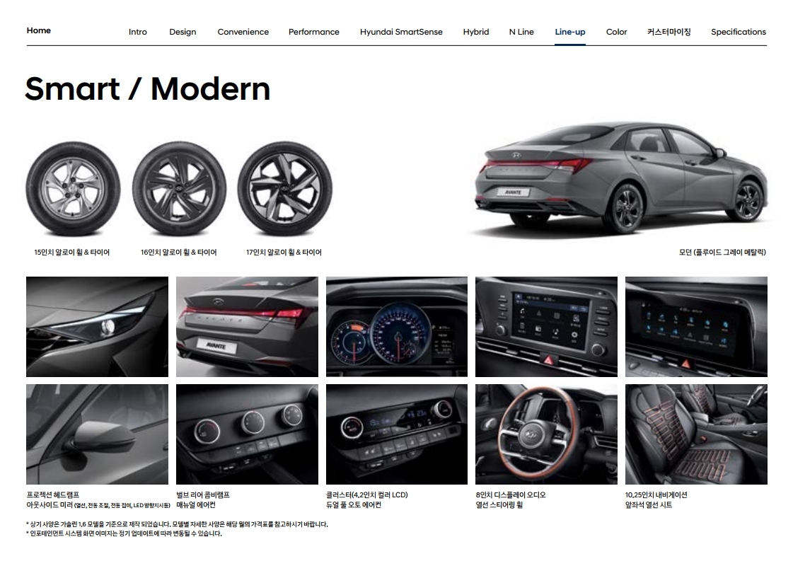 다만 마진이 적은 소형차 특성 상 등급 간 외형 차이가 존재합니다. 제조사 입장에서 더 많이 남는 높은 등급으로 유도하기 위해서지요. 신형 아반떼는 헤드램프와 테일램프, 그리고 휠로써 등급 간 차별을 두었습니다. 가령 기본형(스마트)은 15인치 스틸 휠을 달고 나옵니다. 커버 달린 ‘깡통 휠’이라 저가차 느낌을 많이 냅니다. 테일램프는 벌브 타입입니다. 헤드램프는 노란 할로젠 광원을 쓰죠. 디자인에 민감한 분이라면 꽤 신경 쓰일만한 요소들입니다.