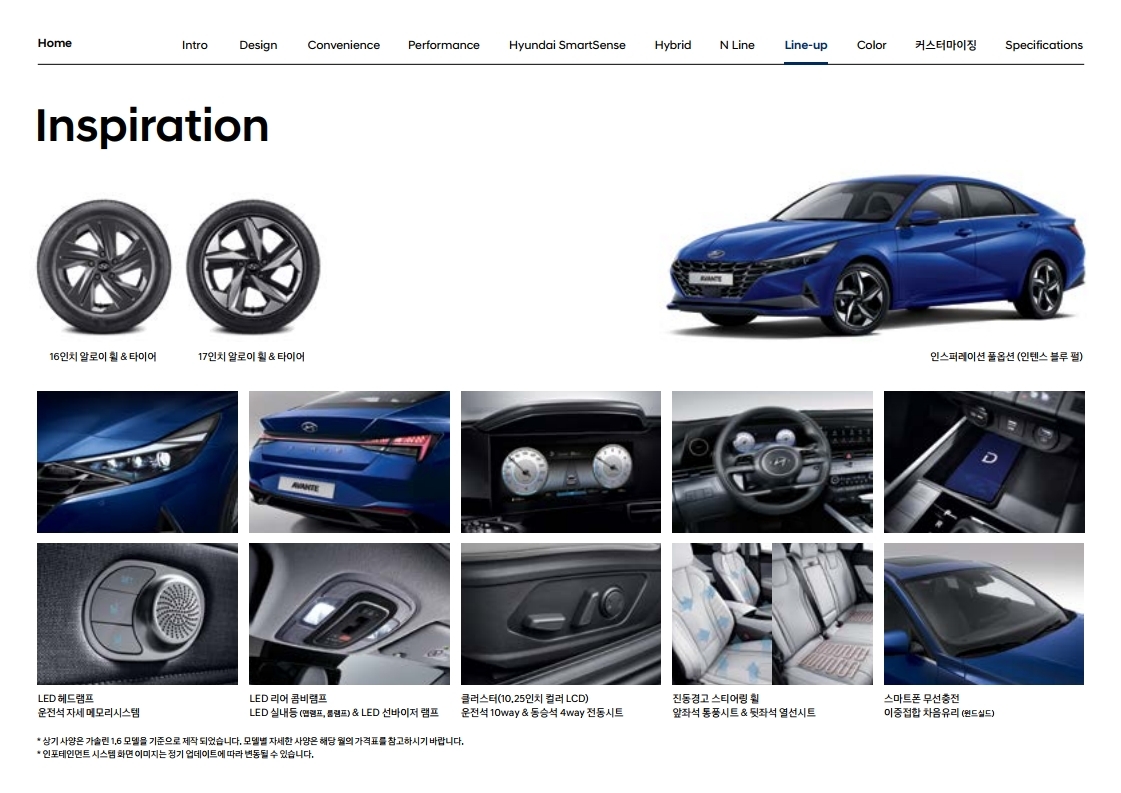 인스퍼레이션은 지금까지 언급한 것들을 모두 달고 나옵니다. LED 헤드램프와 LED 테일램프, LED보조제동등을 장비하고 창틀 아래에는 얇게 크롬 장식도 더해집니다. 휠은 어두운 색상의 16인치 알로이 휠이 기본. 30만 원 추가 시 17인치 휠로 바꿀 수도 있습니다.