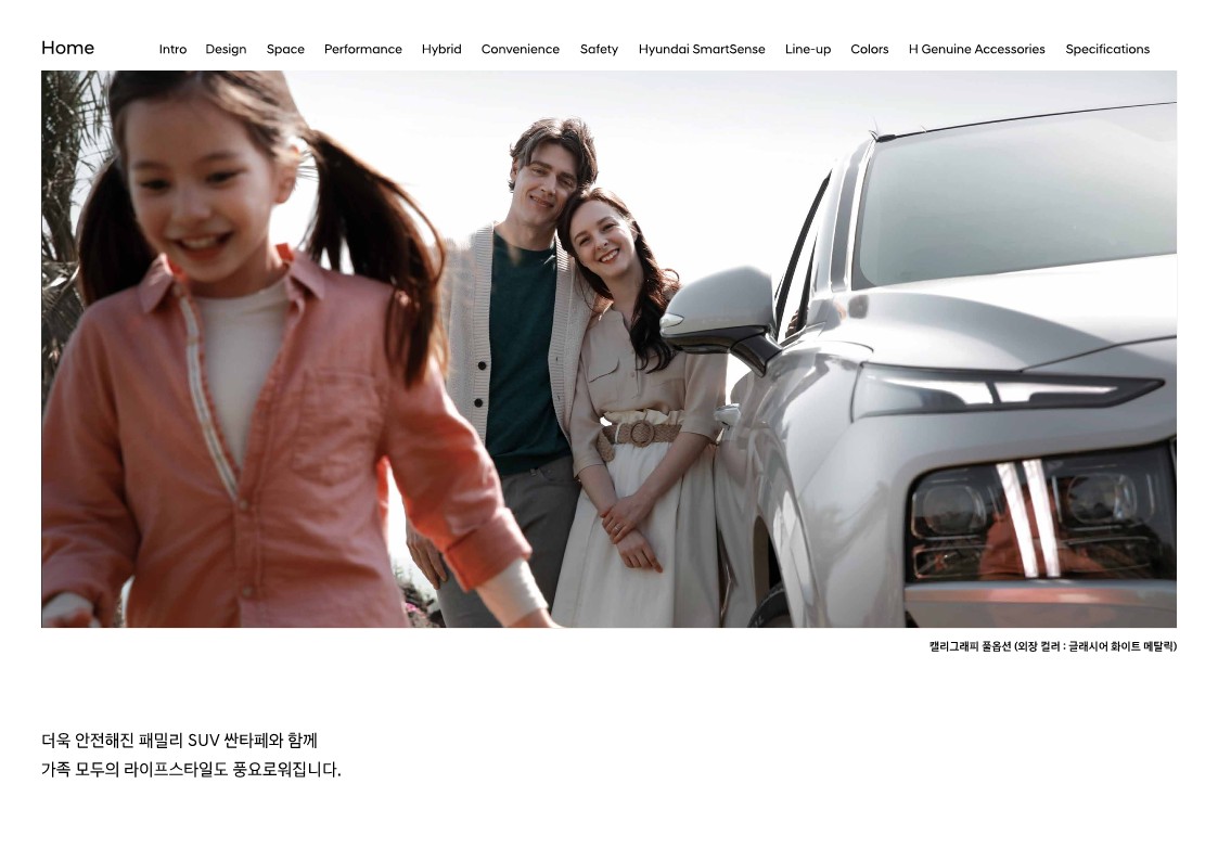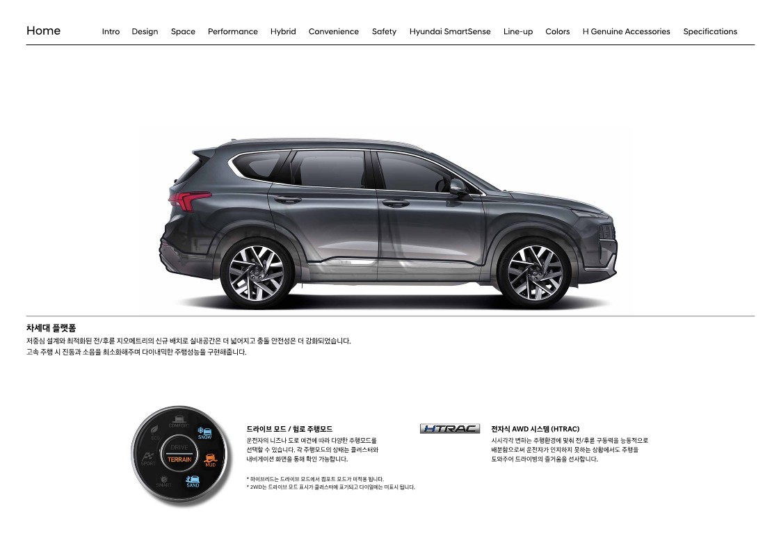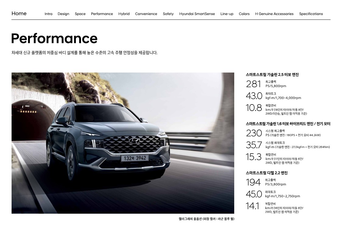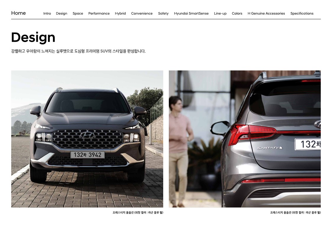 더욱 고급스럽고 세련된 도심형 SUV의 이미지를 이어가기 위해 현대자동차는 일체형 그릴과 헤드램프를 더 뉴 싼타페에도 적용했습니다. 헤드램프는 상하로 나누어져 있고, 그릴은 가로로 넓게 퍼져 있으며, 주간 주행등은 이와 대비되는 수직 형태로 자리 잡고 있습니다. 헤드램프는 LED가 기본이나 MFR 타입으로 들어갑니다. 프레스티지로 올라가야 프로젝션 타입으로 바뀌죠. 방향 지시등도 마찬가지입니다. 아쉽게도 익스클루시브에서 프로젝션 타입의 LED를 추가할 수 있는 방법은 없습니다.