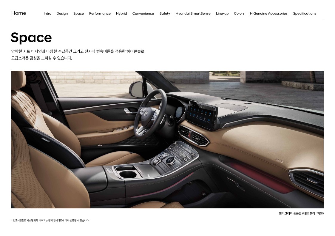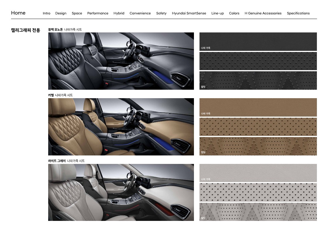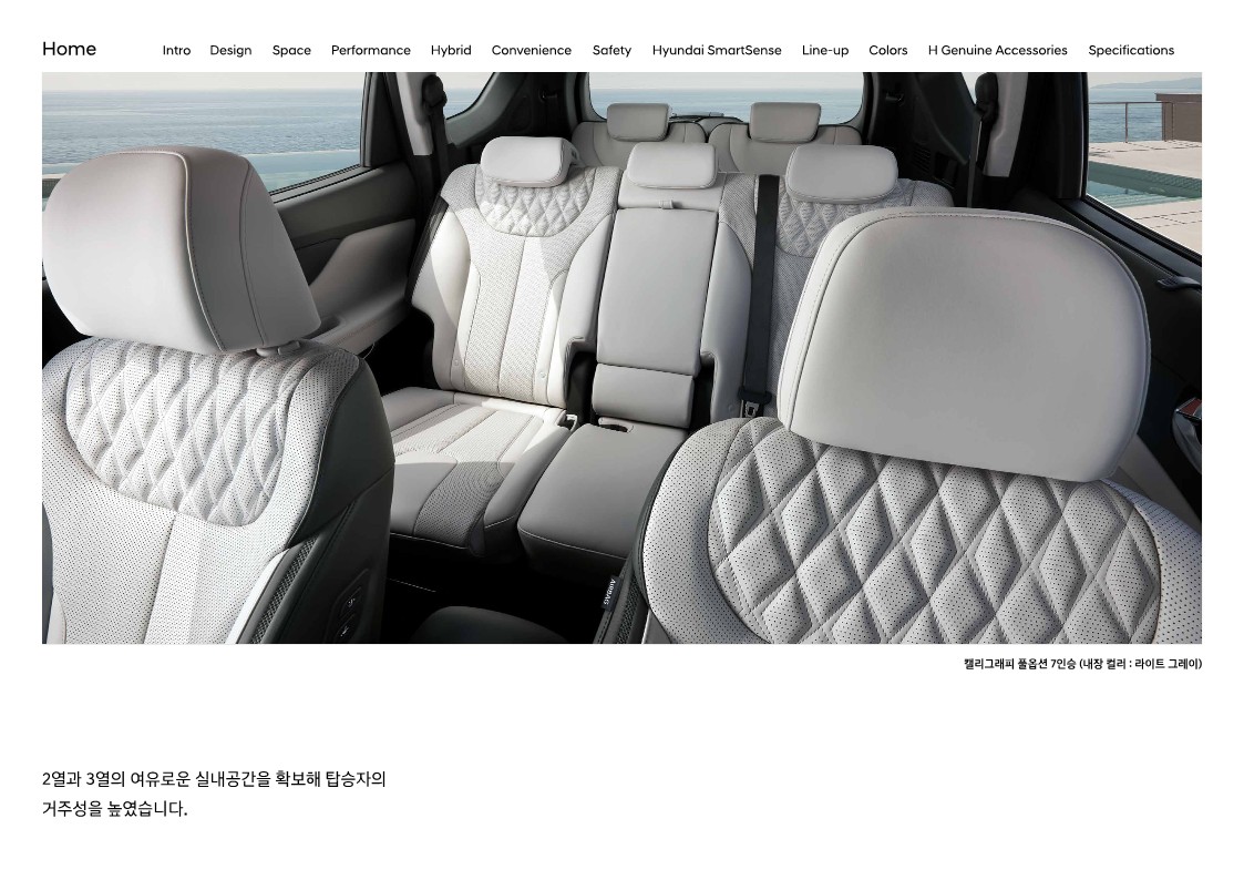 기본 시트는 인조 가죽입니다. 하지만 앞좌석 통풍과 열선은 기본으로 들어가고 2열 열선시트도 마찬가지입니다. 운전석에는 2way 럼버 서포트도 지원하고, 2열 6:4 분할 폴딩과 슬라이딩 그리고 리클라이닝도 가능합니다. 그럼에도 아쉬운 점은 스마트 원터치 워크인과 폴딩은 7인승에서만 추가할 수 있습니다. 5인승을 원한다면 누릴 수 없다는 뜻이죠. 대신 캘리그래피에서는 5인승에서도 2열 원터치 폴딩과 리모트 폴딩이 기본으로 들어갑니다. 스마트 원터치 워크인은 7인승에서만 가능하지만요.