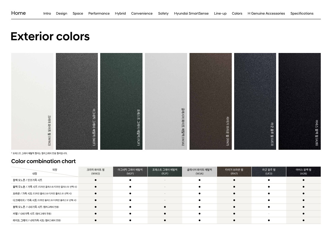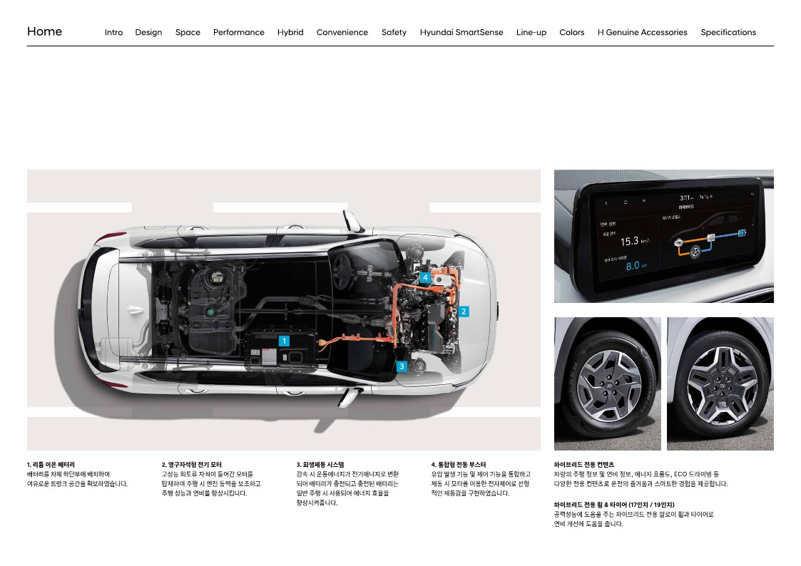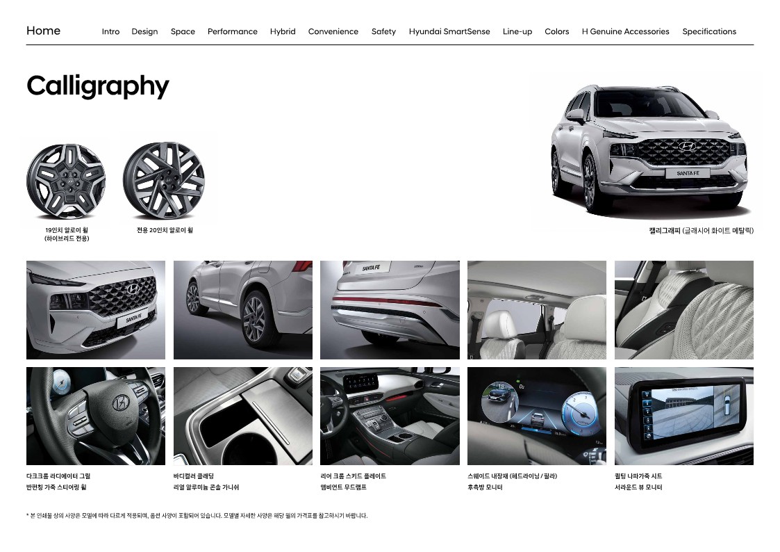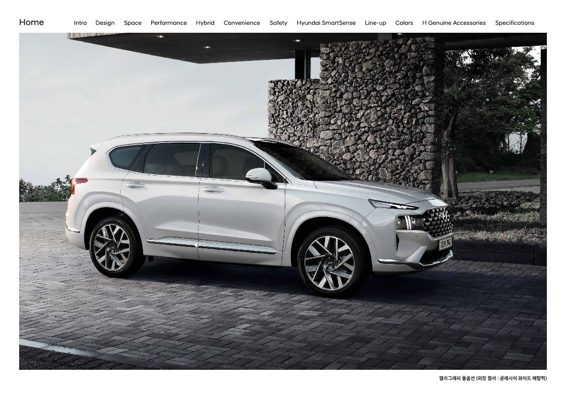 차세대 플랫폼 위에 완성되어 길이는 늘어났지만, 측면 라인에는 큰 변화가 없습니다. 캘리그래피에서만 보디 컬러 클래딩이 적용되는 점은 가솔린/디젤 모델과 동일합니다. 조금 덧붙이자면, 캘리그래피 전용 디자인은 라디에이터 그릴을 비롯해 보디 컬러 클래딩, 리어 스키드 플레이트가 추가되면서 차별화된 디자인을 구현하는 것이 특징입니다.