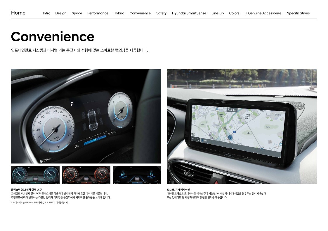 부분변경을 거치기 이전과 비교해보면 실내 레이아웃은 큰 변화가 없습니다. 수평형 레이아웃은여전합니다. 하지만 실내를 구성하는 요소들의 변화에는 눈길이 갑니다. 팰리세이드와 유사합니다. 가장 큰 변화는 바로 전자식 변속 버튼입니다. 가솔린과 디젤 그리고 하이브리드 모델 모두 기본 등급부터 적용됩니다. 하지만 클러스터는 아날로그로 4.2인치 컬러 LCD가 기본입니다.
