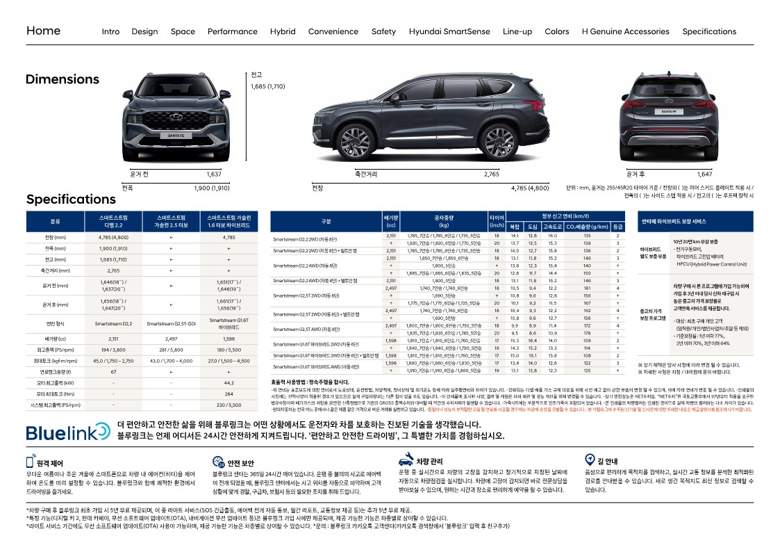 길이는 4,785mm, 너비는 1,900mm, 높이는 1,685mm입니다. 4세대보다 길어졌고 높아졌고 넓어졌습니다. 휠 베이스는 2,765mm로 변함 없습니다. 쏘렌토 하이브리드와 비교하면 더 짧고 낮습니다. 너비는 같지만요. 휠 베이스도 쏘렌토보다 5츠 짧아 실내 공간이 조금 더 좁습니다. 하지만 체감될 만큼 큰 차이는 아닙니다.