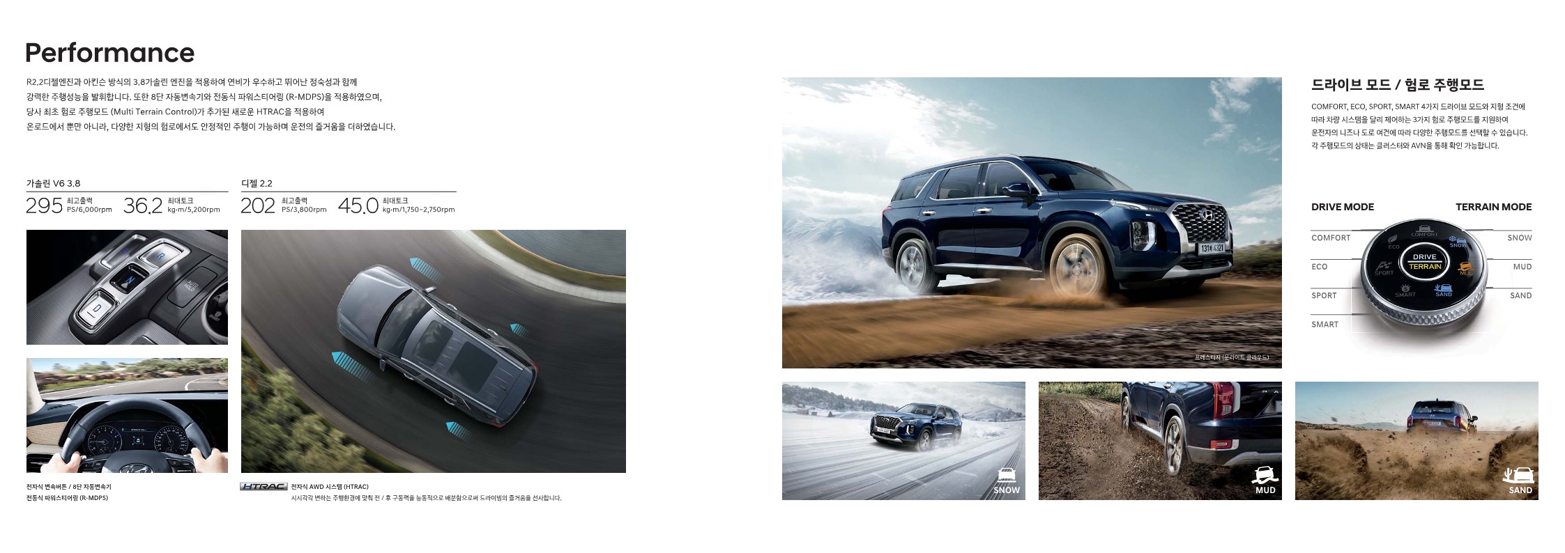 디젤과 가솔린로 구성된 파워트레인은 특별하진 않습니다. 직렬 4기통 디젤 엔진과 V6 가솔린 엔진은 8단 자동변속기와 맞물립니다. 최고 출력 202마력, 최대 토크 45.kg.m의 성능을 발휘하는 2.2 디젤 모델은 2톤에 가까운 차를 다루기에 다소 부족하지 않을까 생각됩니다. 그래서 가솔린 모델로 준비해봤습니다. 시승한 모델은 3.8 가솔린 프레스티지 전륜구동 7인승입니다.